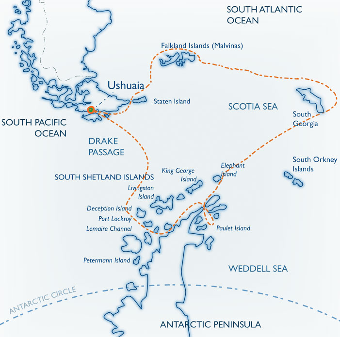 N.B. El itinerario descrito arriba es sólo una guía. Nuestra ruta exacta y el programa pueden variar para poder tomar las mejores ventajas del clima local, de las condiciones del hielo y de las oportunidades de ver vida silvestre. Los cambios serán hechos por el capitán y el líder de expedición para facilitar los mejores resultados con las condiciones predominantes. Un programa diario será publicado a bordo. La flexibilidad es la clave del éxito.